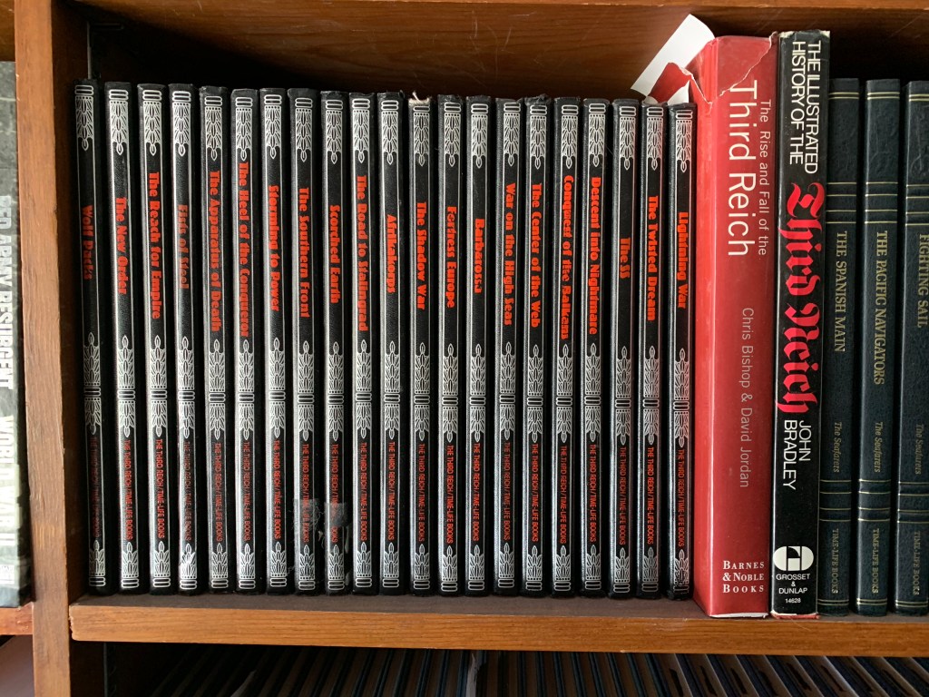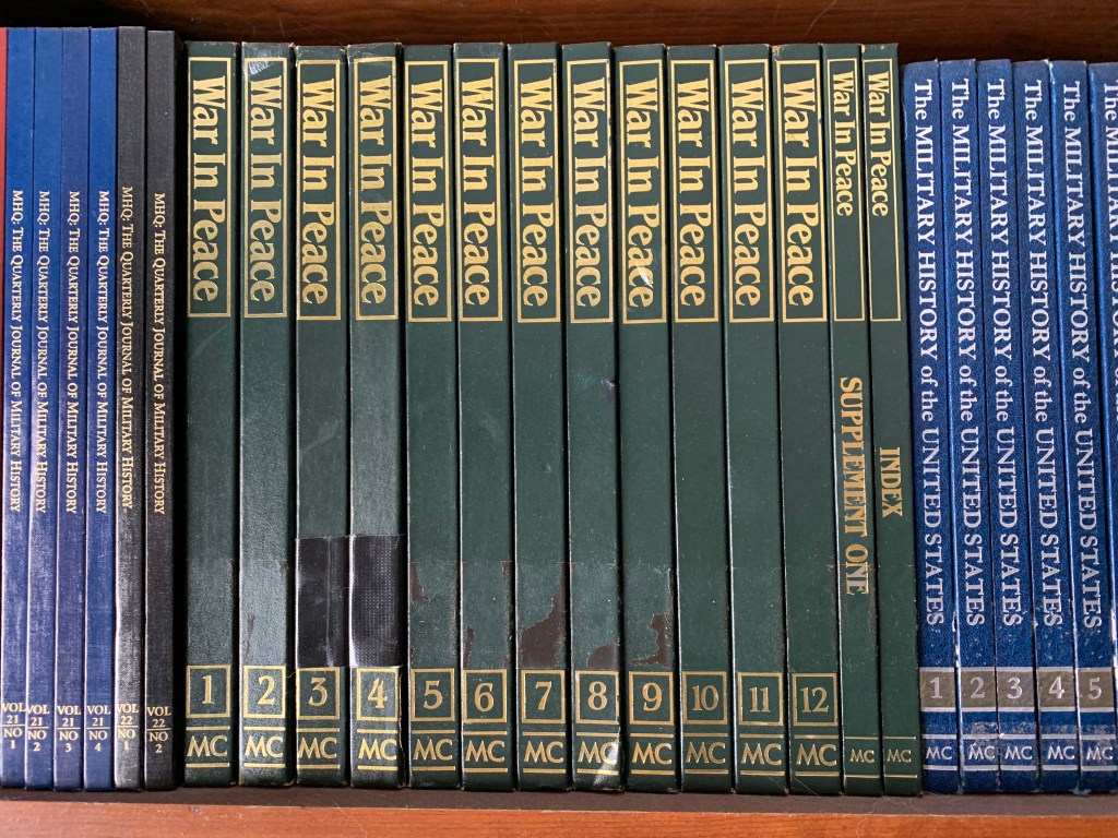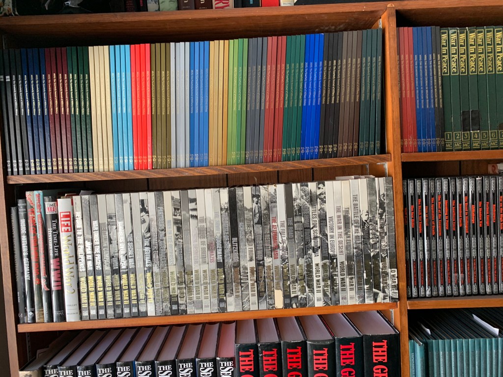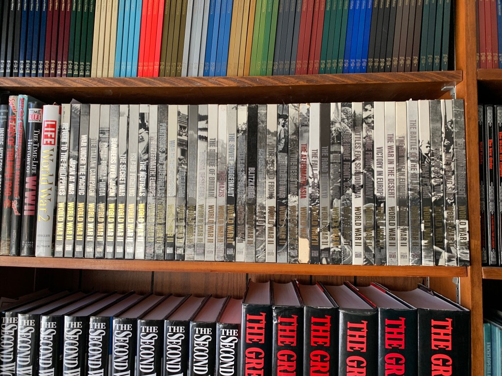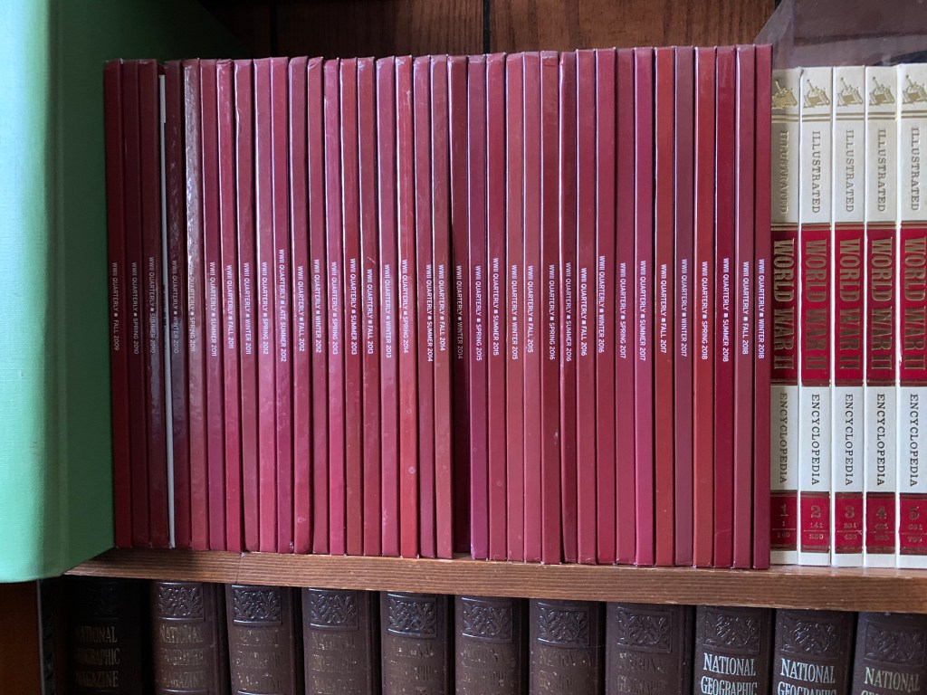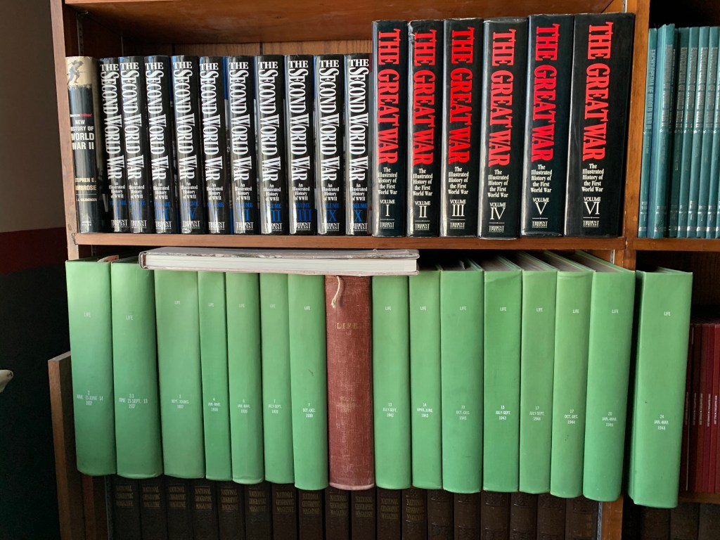 There are the Life Magazine bound volumes, which cover World War II and the years leading up to it. Military Heritage Quarterly’s bound volumes make up the colorful bindings on the top-left.