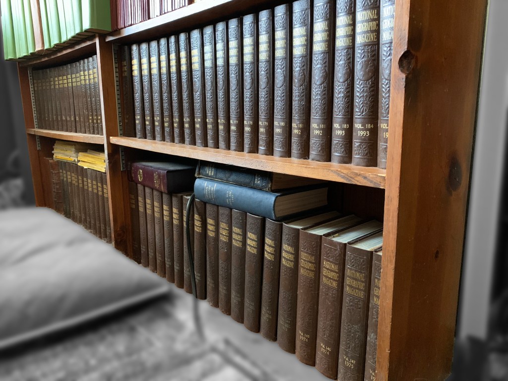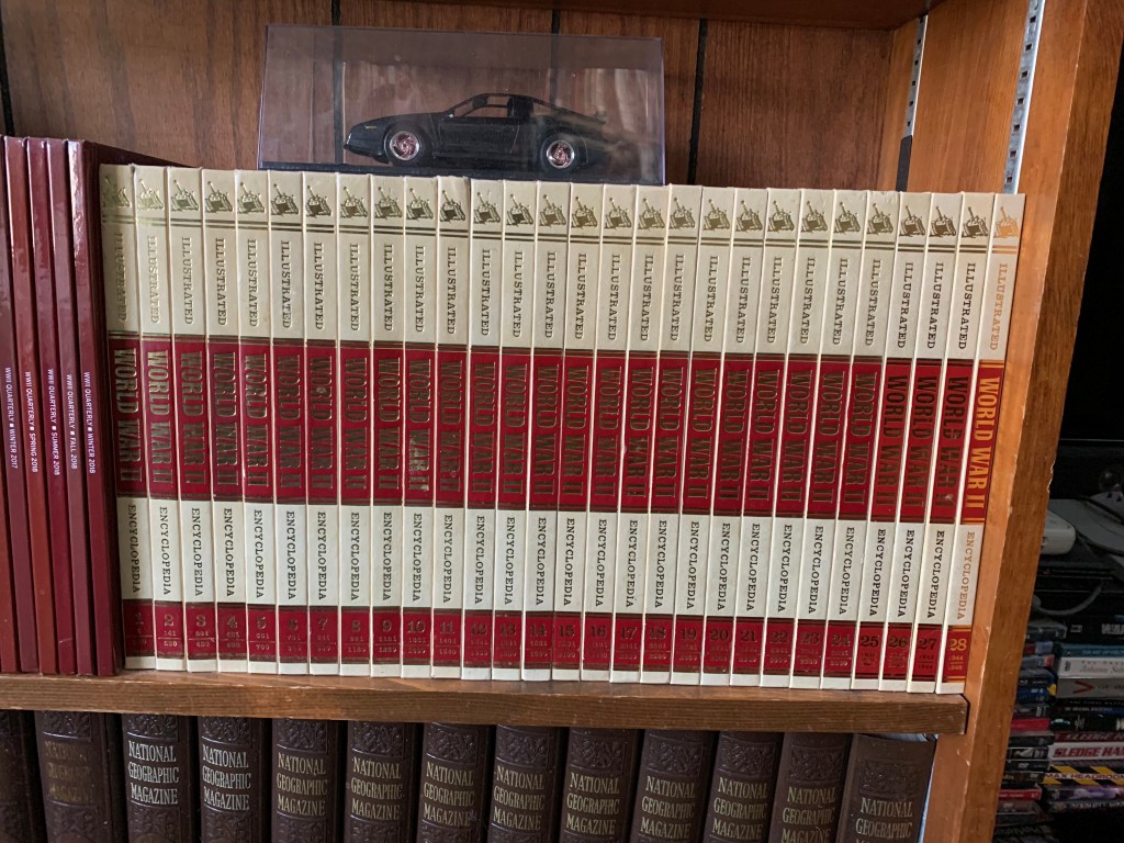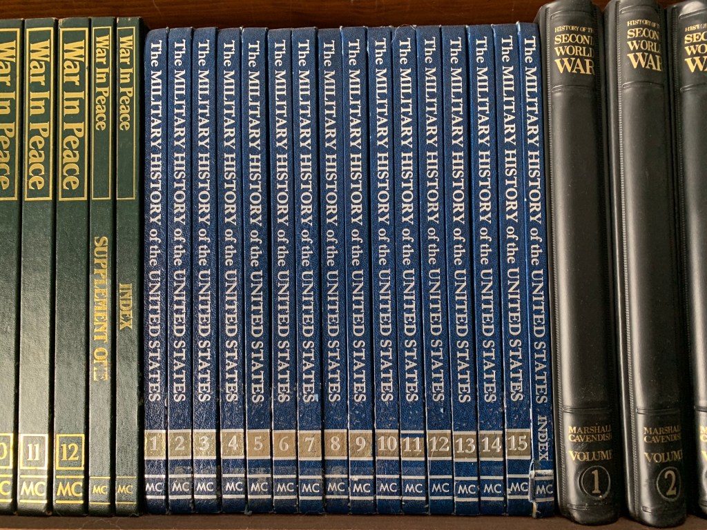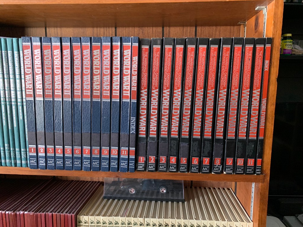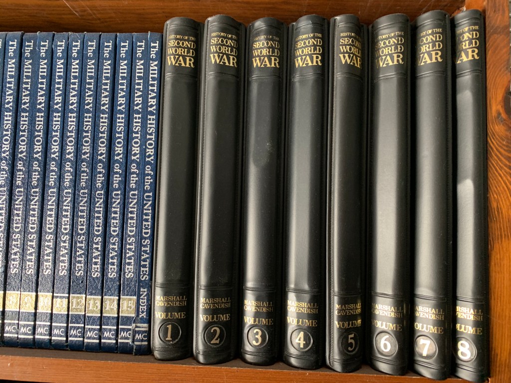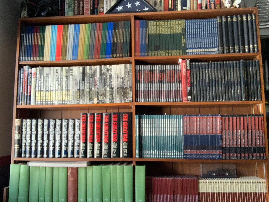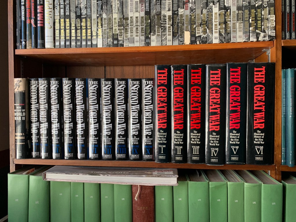 There are the Life Magazine bound volumes, which cover World War II and the years leading up to it. Military Heritage Quarterly’s bound volumes make up the colorful bindings on the top-left.