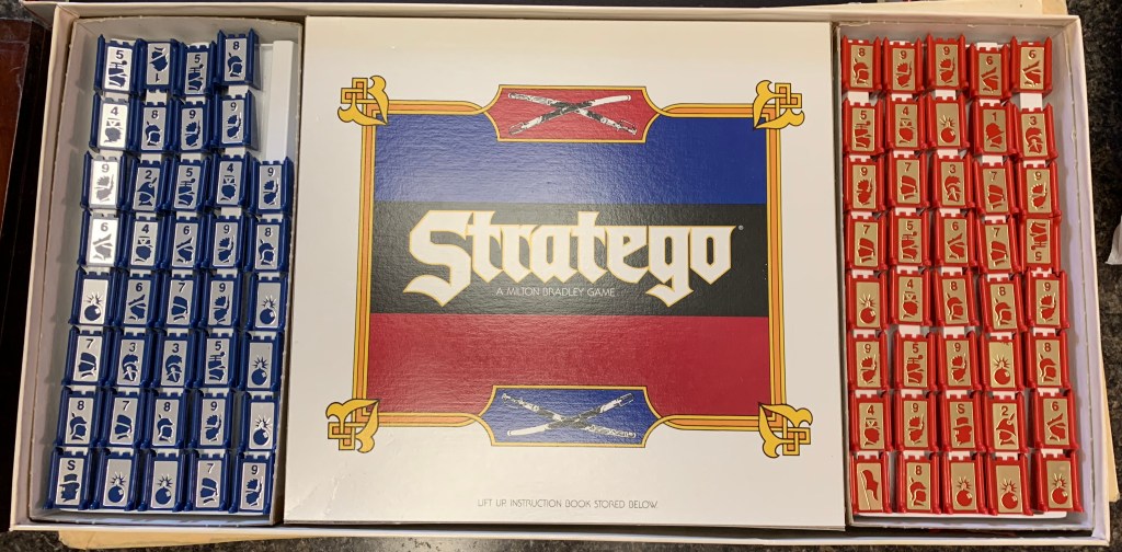And I also have a newer release of Stratego with pieces like the classic, but lost version we used to have. Modern, recent versions have the numbers on the pieces backwards, whereas the most powerful piece used to be “1”, it is now “9”. No way. I’m not playing it that way, it’s just wrong. Why did they change it?