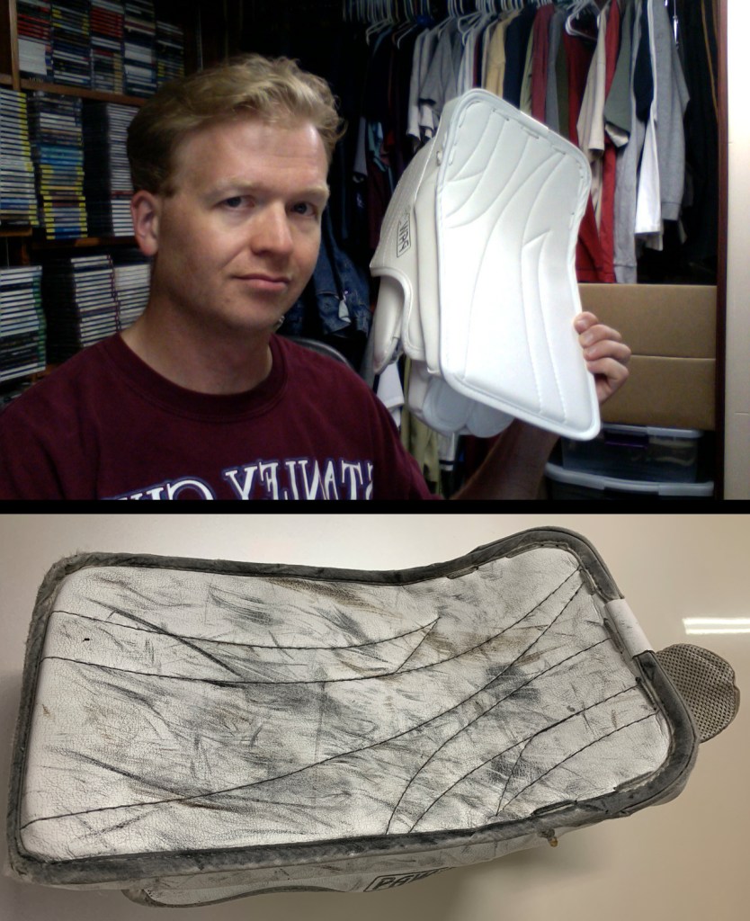 My Protective Althetic Wear custom-made blocker back in 2013 when it was new, and now. Still going strong, just not as clean! The rest of my gear is at Smokey’s Skate Shop getting repaired and overhauled for the second time. Three games a week will do that. I’d get the blocker re-palmed, but that doesn’t last so long and I never really notice anyway. Wearing sport gloves in addition negates that need for me, until it gets really bad. Otherwise I’d be getting re-palmed every couple of months.