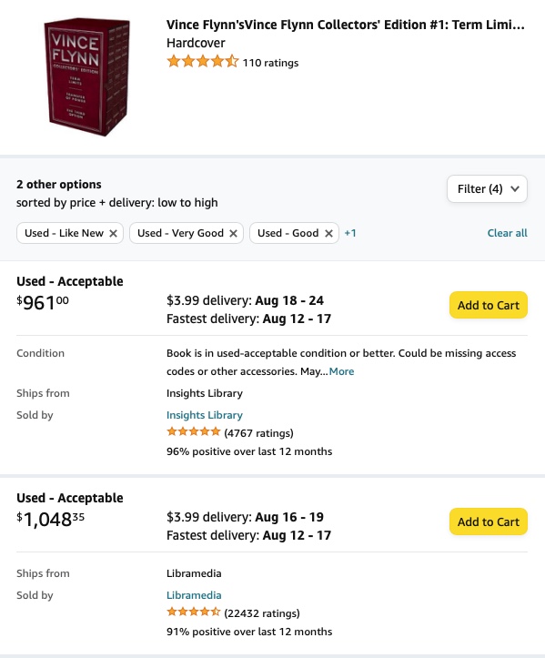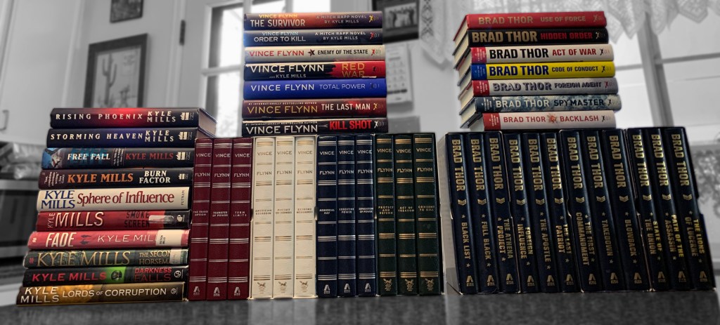 Also. I’ve been picking up the additional, newer volumes at thrift stores over the past five years… the newer books take a while to show up there, but at the moment, I’m currently caught-up except for the Kyle Mills books. He’s an extreme rarity in the used book stores and thrifts, only one or two of his can ever be found there. I might just buy the new Flynn/Thor books brand new as this journey is such a long one, it wouldn’t be right to end it a book early because of the price. It isn’t like the books aren’t worth full, or used price.