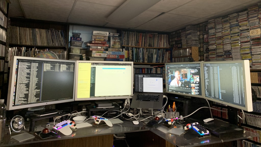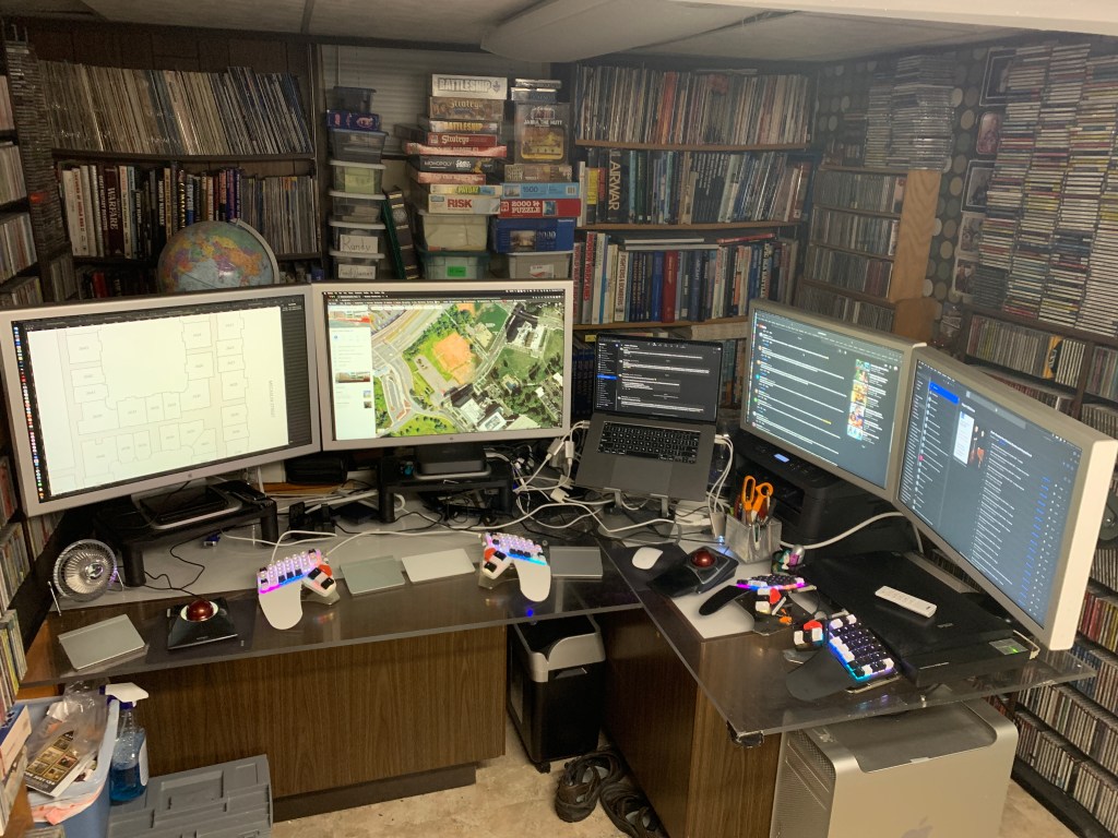 At some point, I’m going to get some sort of improved desk setup, but that looks to be a really tough endeavor as I need a lot of space, and am going to want a desk that transitions from sitting to standing, but can handle all of the weight my stuff has. Maybe two standing desks? And how am I going to get my current “desks” out of this room, where will they go, and what will I do with the stuff I store in them? (What’s left of my comics collection, drawings, thousands of slides, boxes of photos, stuff like that). So, I’m going to put that off… maybe forever?