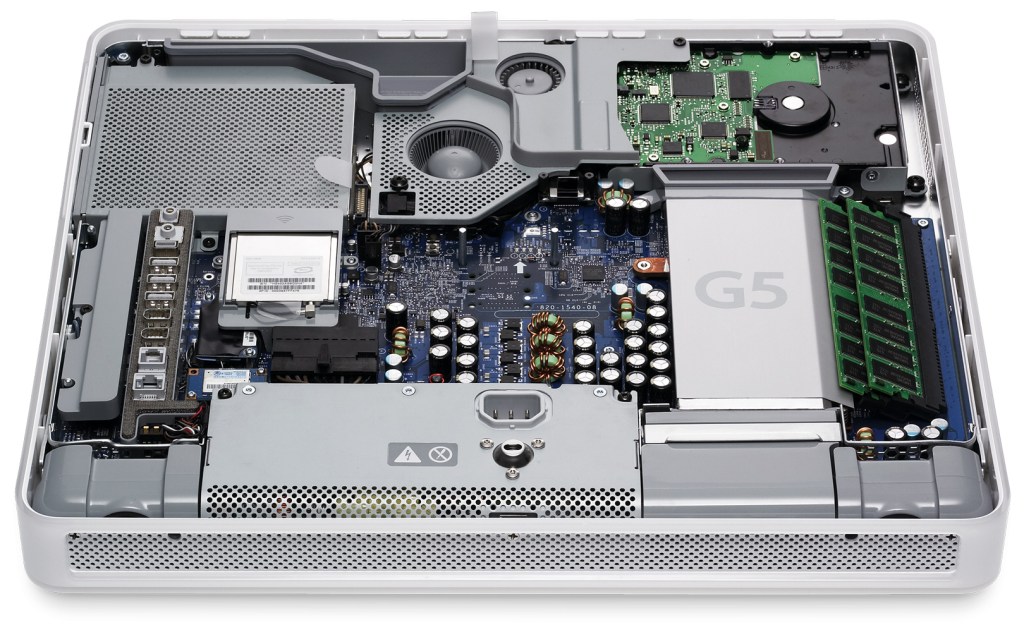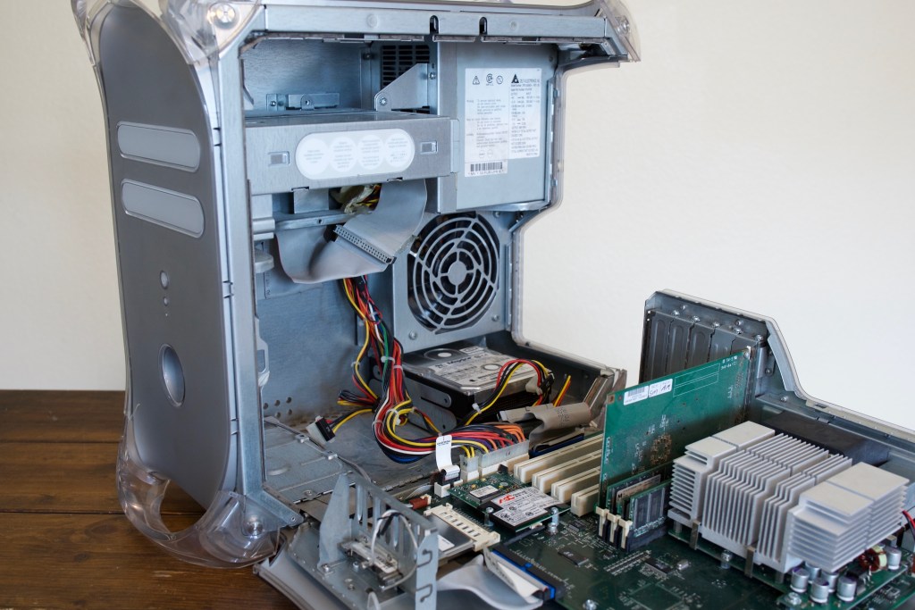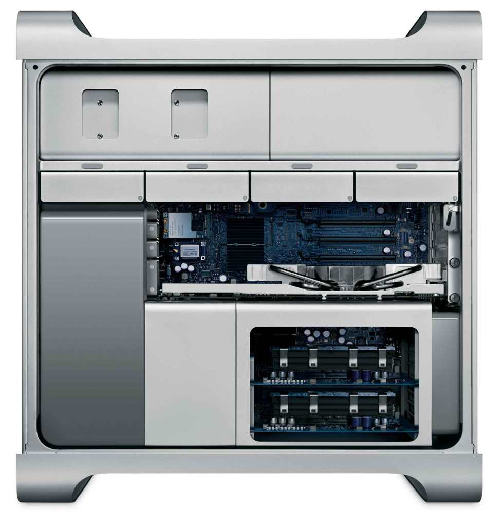 My G3 tower, as old as it is, all one had to do was hit a switch, and the tower would fold out into three pieces, for really easy upgrading or maintenance! The G4, just pull a handle, and the side swung down. My iMac? Use a suction cup on the glass of the display, and what do you know? It’s held on with magnets, and that’s how one accesses the innards of the thing. Just pull the glass off. Simple. And this tower, just hit a switch, and all of the inside is super-easy to work on. But again, it’s even better if one never has to open one of these things.