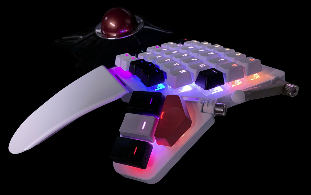 Pictured here is the left half of my ZSA Moonlander, along with my Kensington Slimblade trackball, representing but a portion of my input device ecosystem.