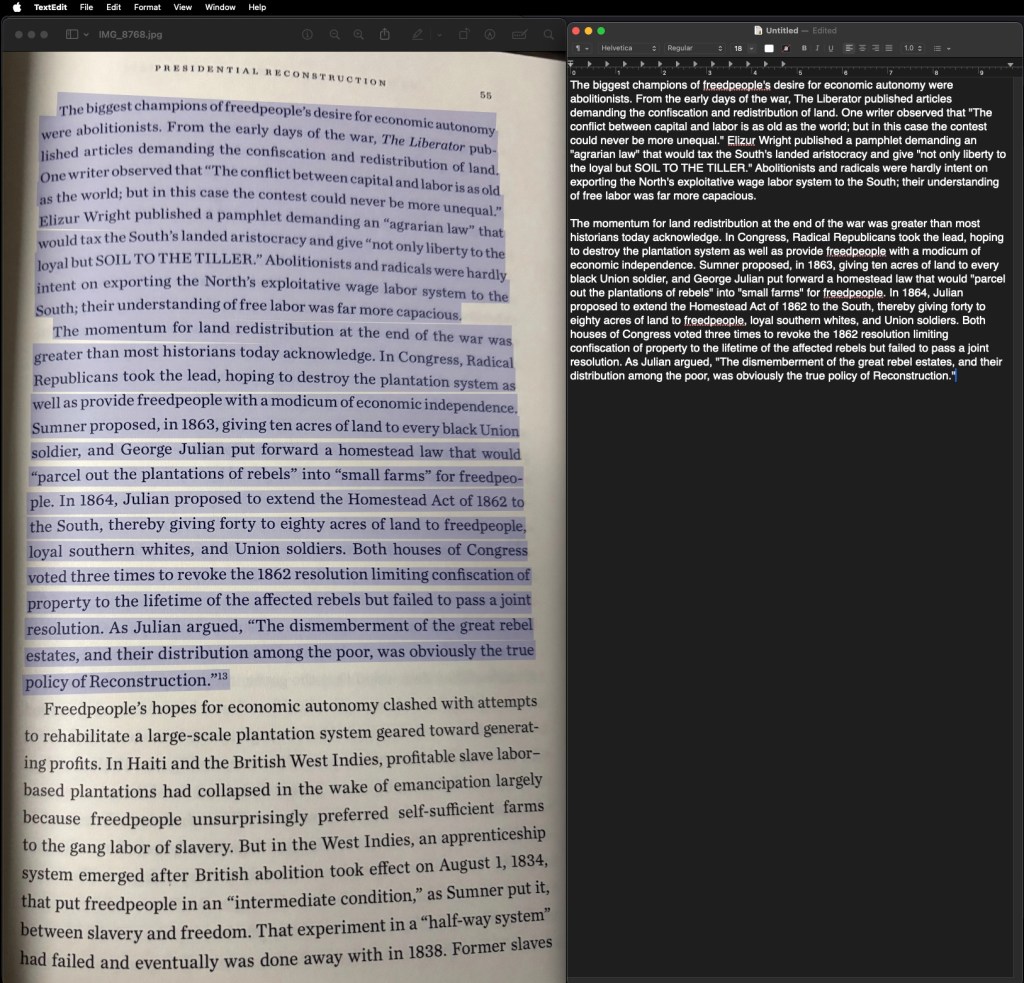 Even better, when I’m on my Mac Mini, to use the built-in OCR, all I have to use is the Preview app to open the photograph of the page, go to Tools > Text Selection (or even better, Automatic Selection), and the OCR goes to work! I just click on the page and after a few seconds, the cursor changes and I can select all of the text! The Automatic Selection option stays selected so I don’t have to do that every time.