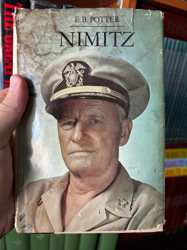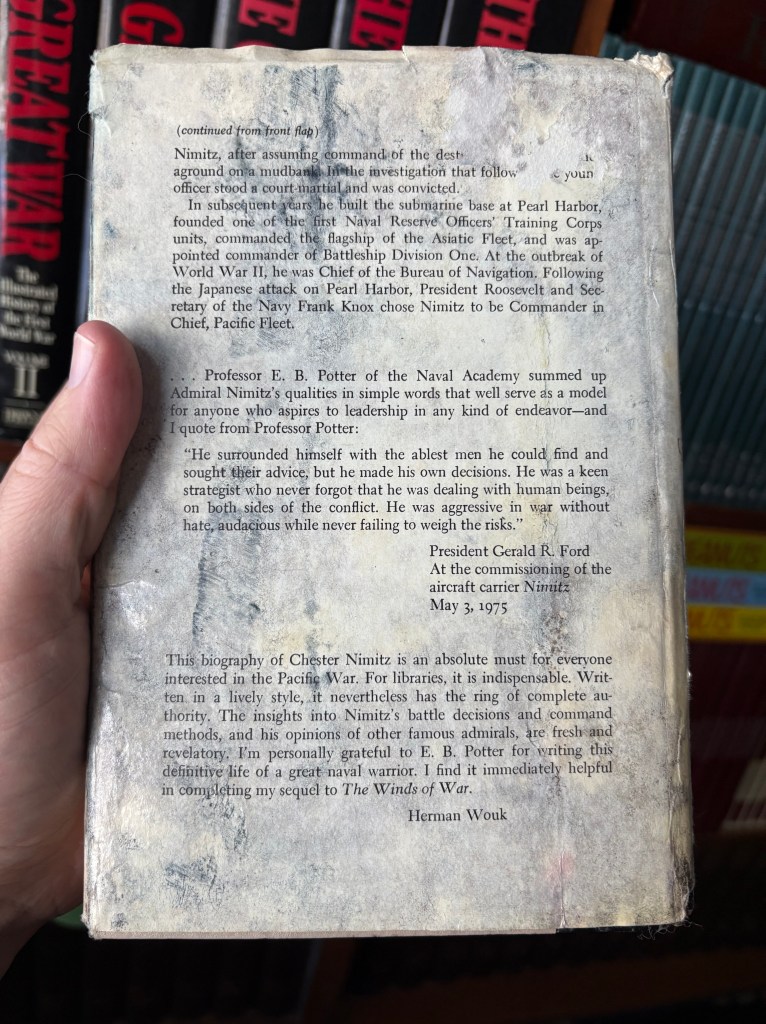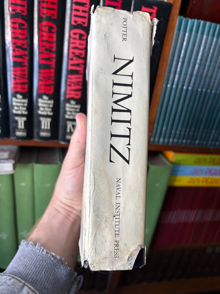 In this case, there are grease or oil stains on the cover and pages and, putting on my detective hat, this probably means that some mechanic was reading this at some point. Because the book was published in the 1970s, I would guess that maybe someone who was actually in the war fixing things, who would be interested in Nimitz enough to read about him. Most people couldn’t care less about Nimitz regardless as to whether they should. Apparently he was important enough to name the current class of aircraft carriers after, so, maybe he was a big deal.