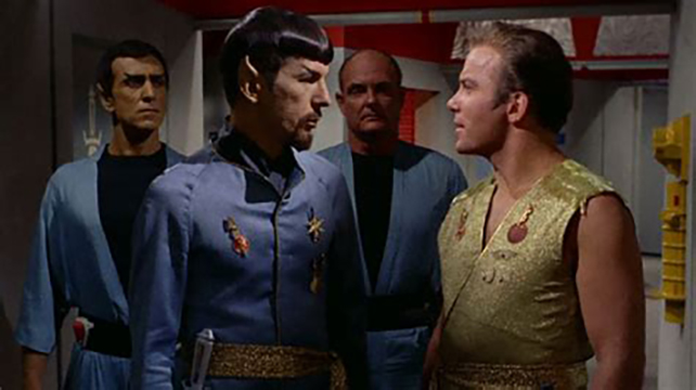 Mirror, Mirror • The episode involves a transporter malfunction that swaps Captain Kirk and his companions with their evil counterparts from a parallel universe (later dubbed the “Mirror Universe”) in which the Enterprise is a ship of the Terran Empire, a conquering and murdering organization where officers are assassinated as punishment and as a means of promotion.