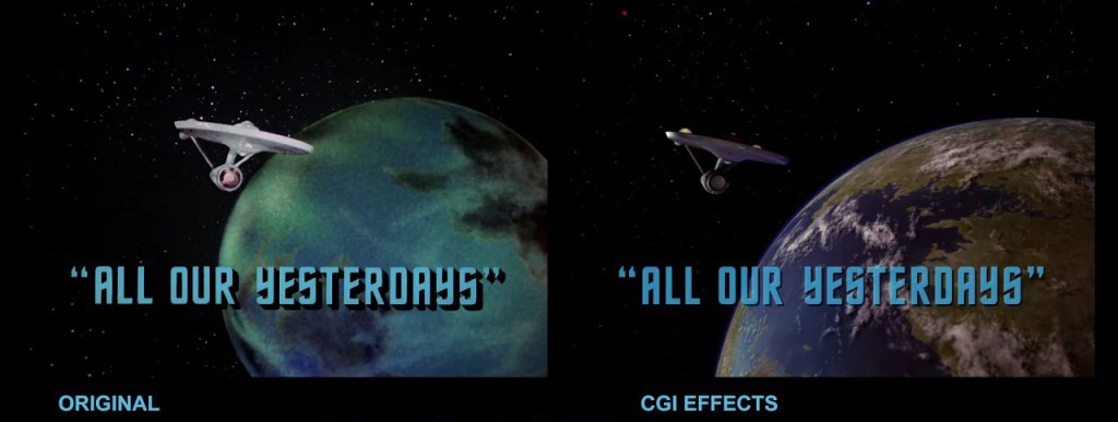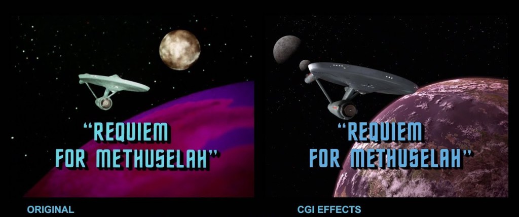 I just finished watching all of the original Star Trek series on Blu-ray, which has the option to watch with either the original special effects, or the new and improved effects. After the hit-or-miss improvements to the original Star Wars trilogy, it is understandable for someone to be pessimistic about these changes. I found these changes to be very respectful to the original material, and in every instance, the improved effects actually make things better. The guy in charge of this said that he tried to keep things as they would have been done, had the original effects team had today’s technologies available to them. From little things like clocks and readouts looking perfectly natural, instead of like old car odometers, to phaser blasts being cleaned up, starships and planets looking more realistic… all of the changes look great, and some are expanded a bit because originally, they didn’t have the time or budget to actually show what they were talking about. It looks great, and helps it match the different series that followed it.