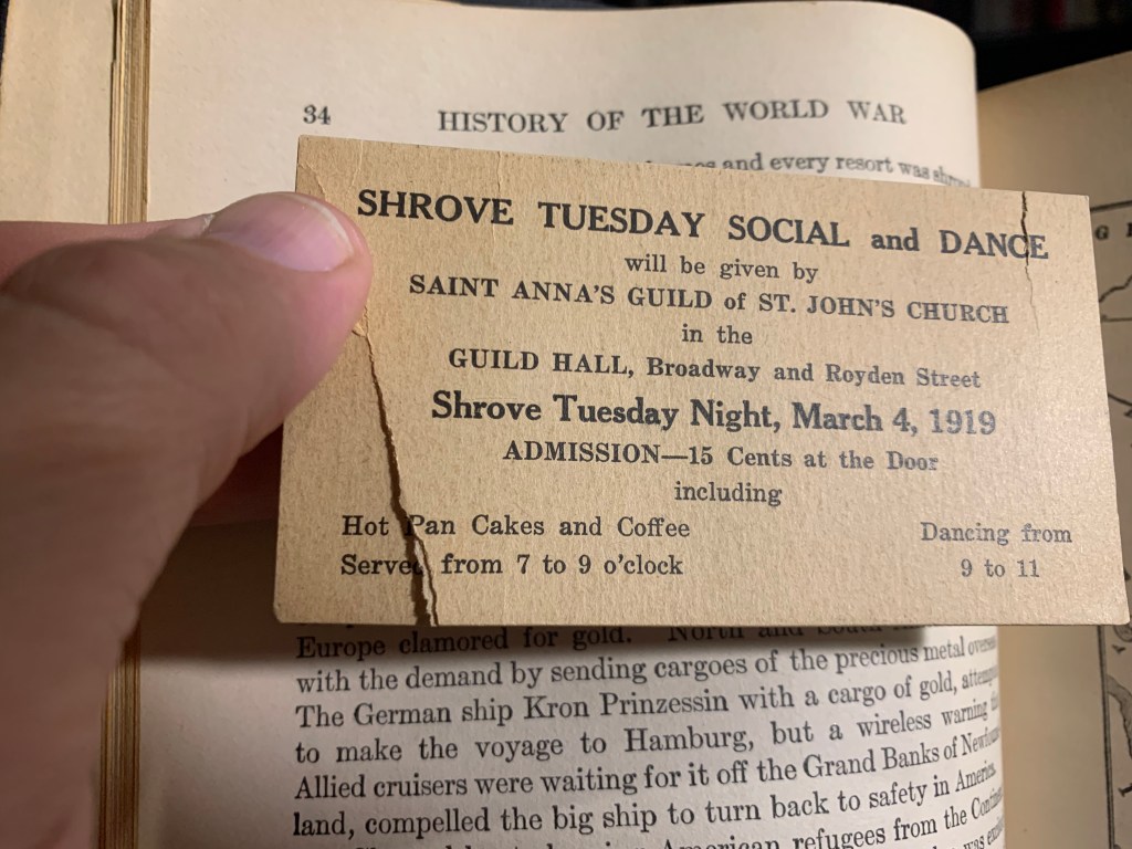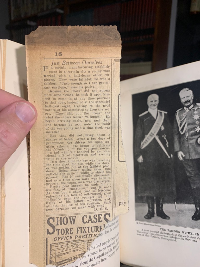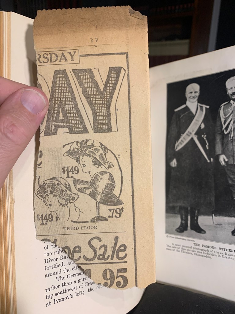 I found a piece of newspaper from what has to be a newspaper more than a hundred years old, and an invitation card from 1919, both used as bookmarks.