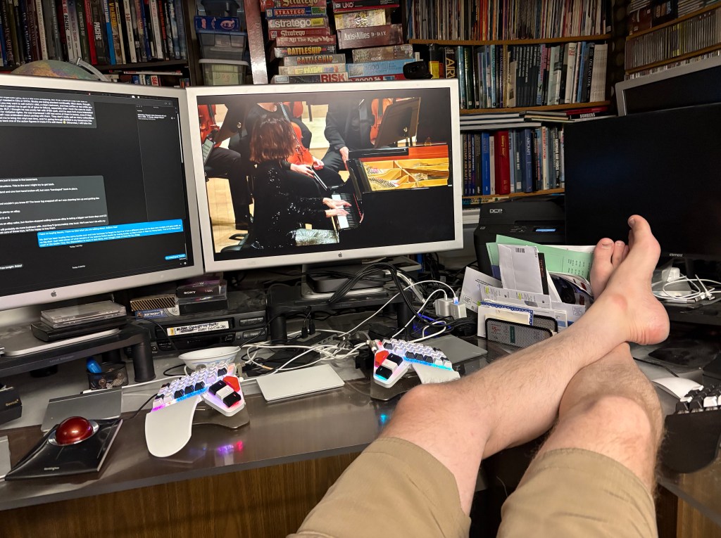 Watching Hélène Grimaud play Gershwin live. We really take for granted that this is even a thing. It wasn’t that long ago that just watching any video on a computer in a tiny window was an event, and now this full-screen concert effortlessly plays, no big deal.