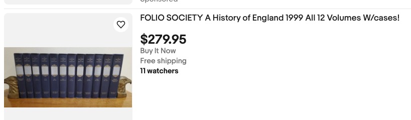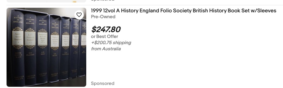 They were asking $125 for this entire set, two of which are on eBay for $250. My dad got them down to $60 and bought them for me. The second day of a garage sale makes the sellers more open to lowering prices, they had a lot of older books that didn’t seem to be moving, unfortunately. I almost bought a really good book on the Boer War that I already had, so, my list continues to pay off! The Folio Society makes great books, so this was a really good deal.
